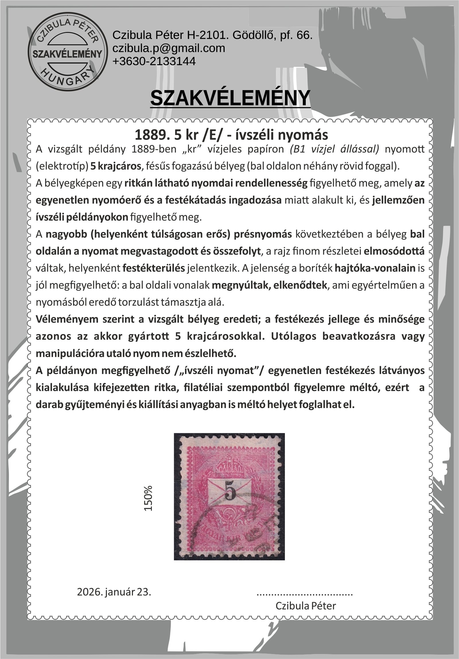 1889. 5kr /E/ – ívszéli nyomat /Czibula szakvéleménnyel/