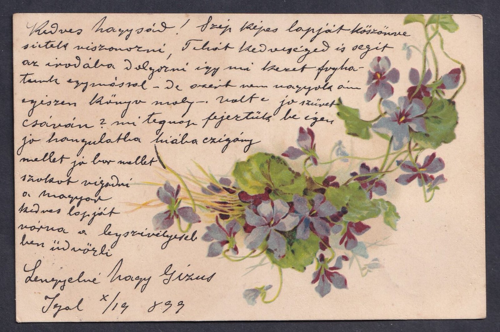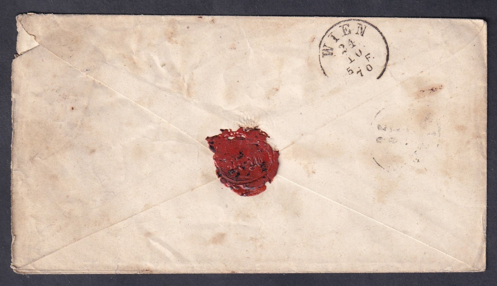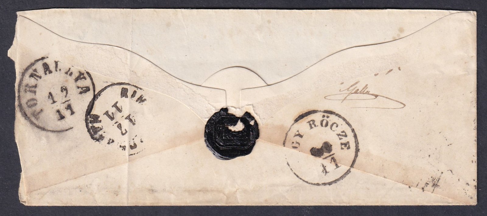 Átmenő bélyegzések: 1871.11.17. Rimaszombat, 1871.11.19. Tornallya; érkezési bélyegzés: 1871.11.20. Nagy Röcze. Kis alakú, érdekes darab, családi viaszpecsétes zárással. A boríték hajtókája hiányzik, nyitási sérüléssel.