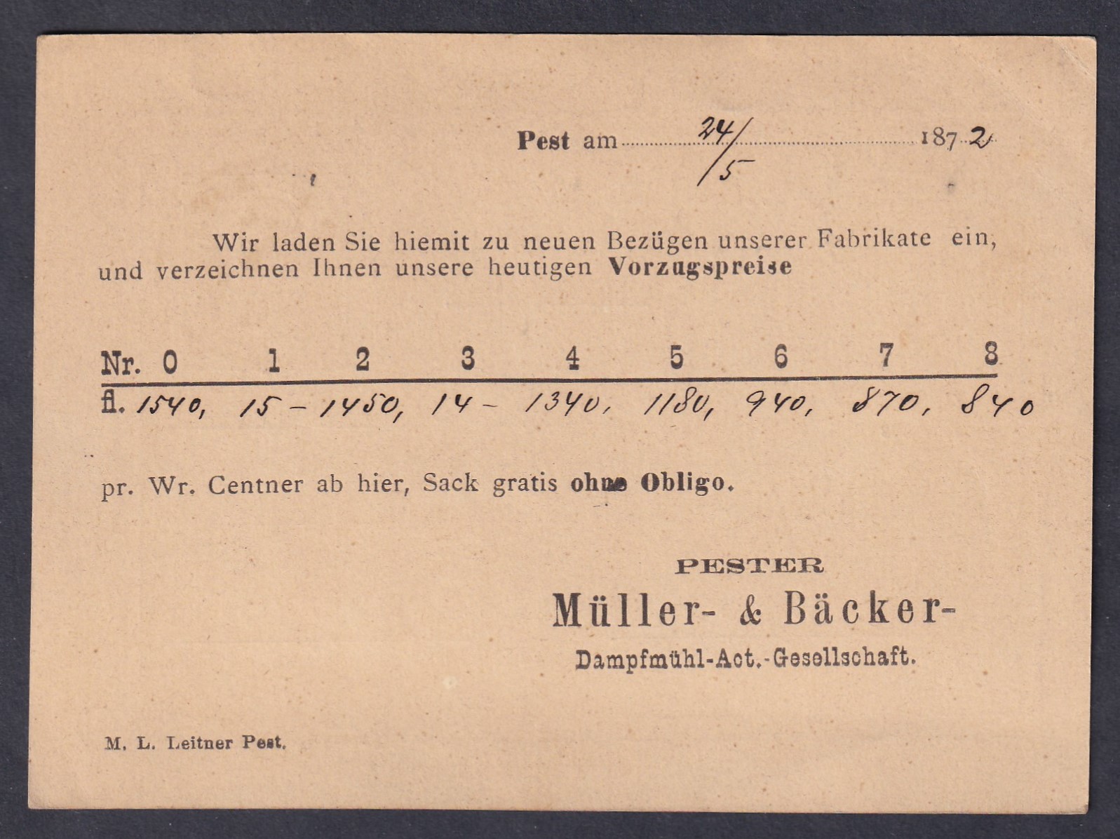 Feladó: Pester Müller- & Bäcker-Dampfmühl-Actien-Gesellschaft Magyarul: Pesti Molnár- és Sütőgőzmalom Részvénytársaság