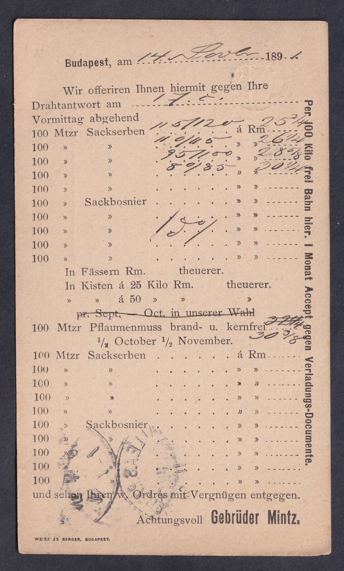1891. Budapest, Halle an der Saale-ba feladott levelezőlap, hátoldalán céges előnyomással