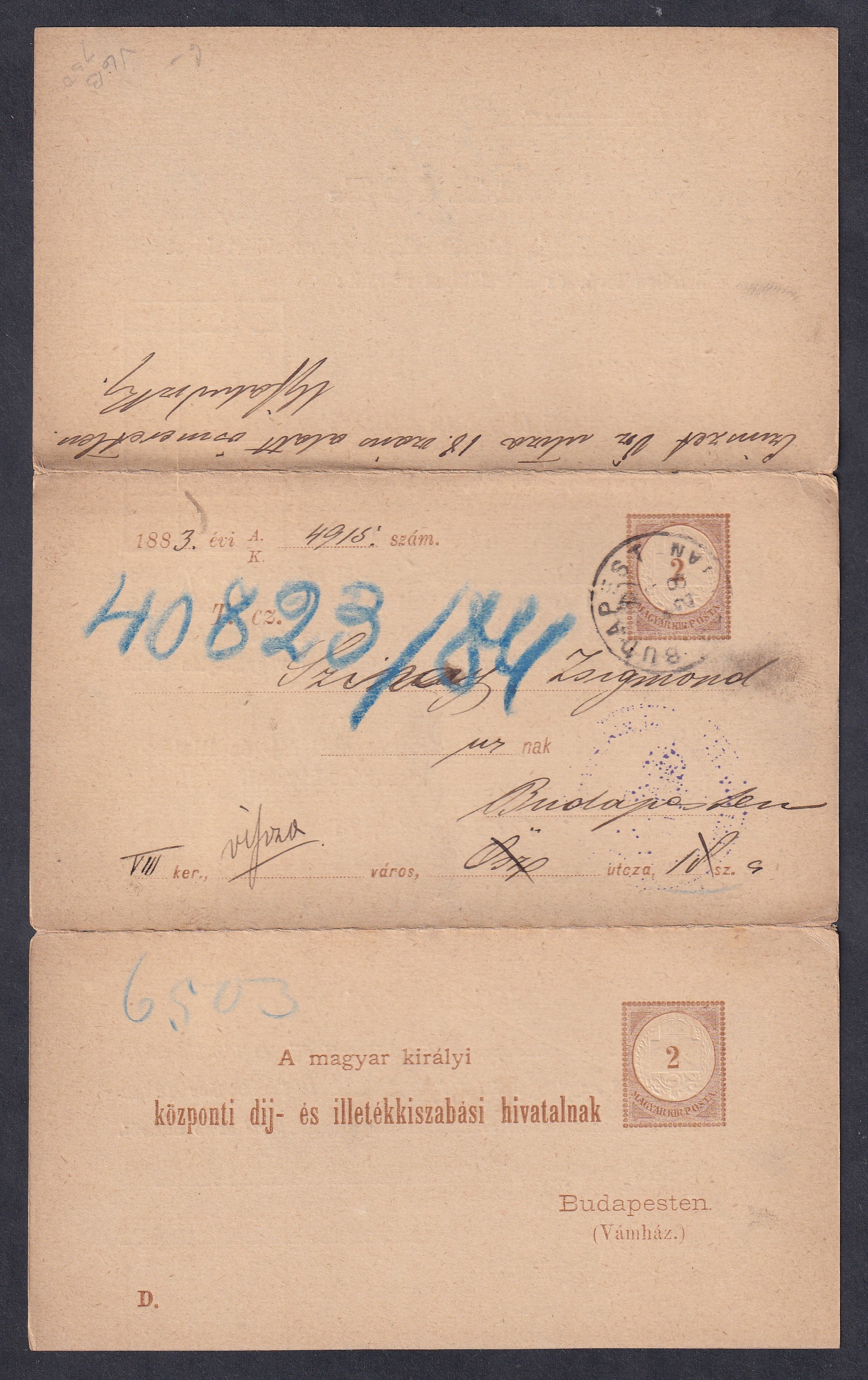1883. Adóintés, teljes darab – mindhárom lap egyben, kezelésekkel; így ritka!