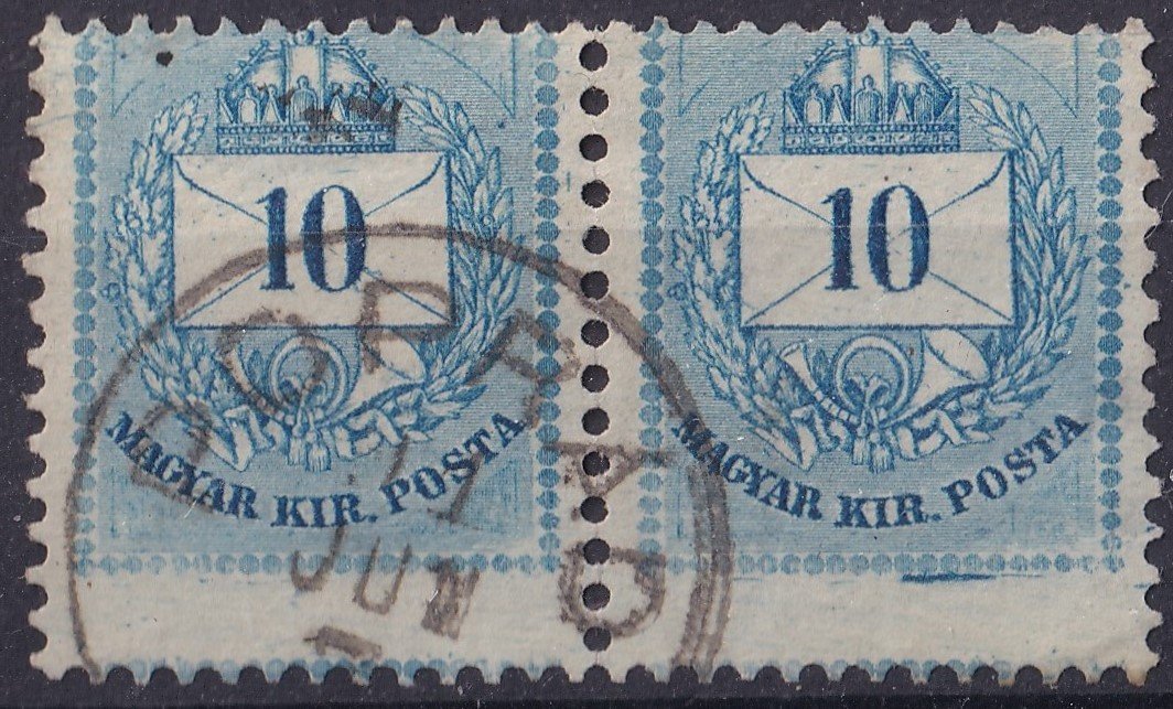 1881. II. 10 kr /E/ – párban, jelentősen elcsúszott a szomszéd bélyeget érintő fogazással