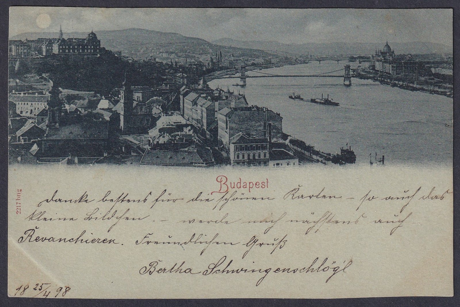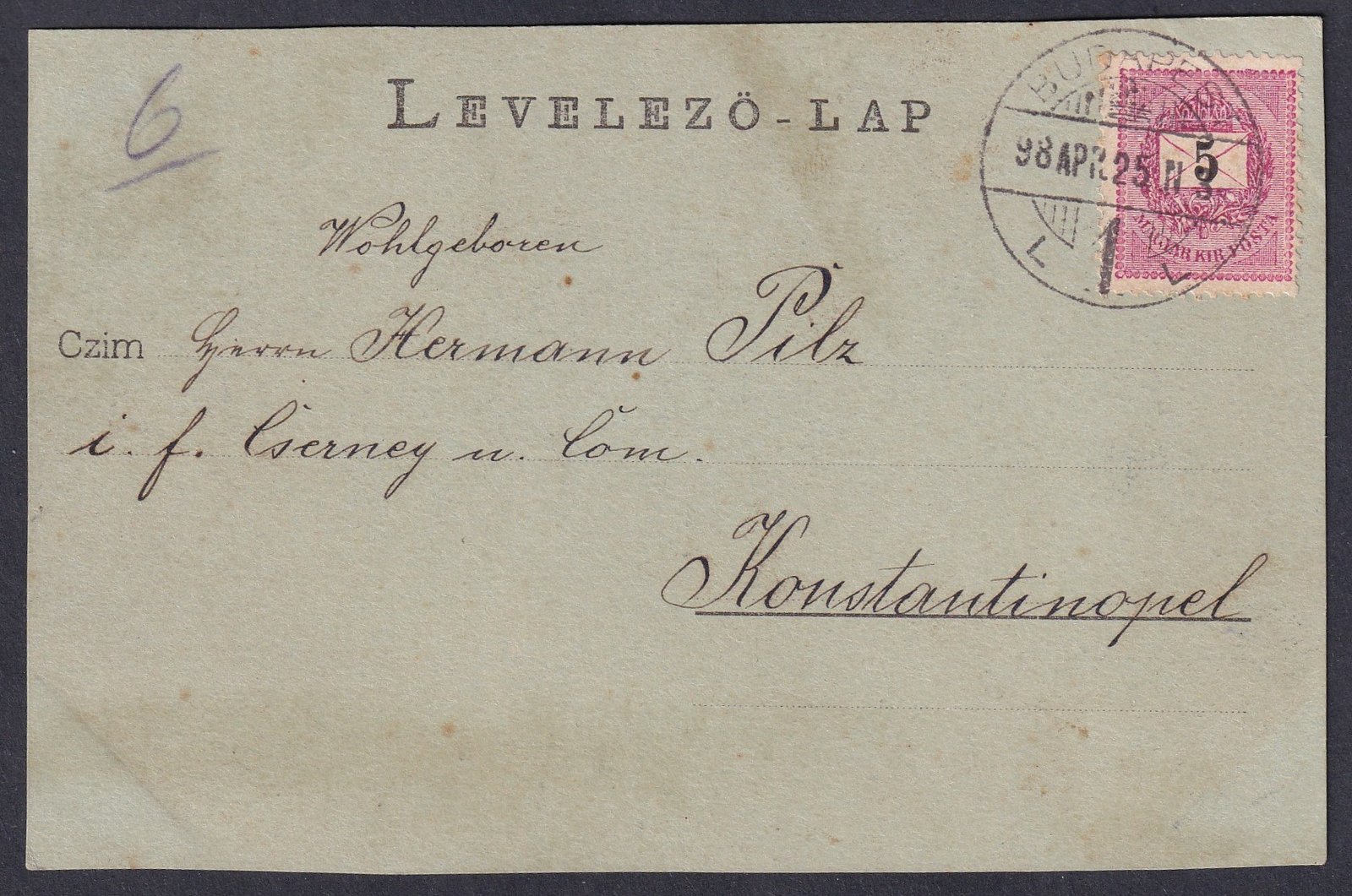 1898-ban Budapestről Konstantinápolyba (Törökország) feladott képeslap – kőnyomatos Budapest-látképpel