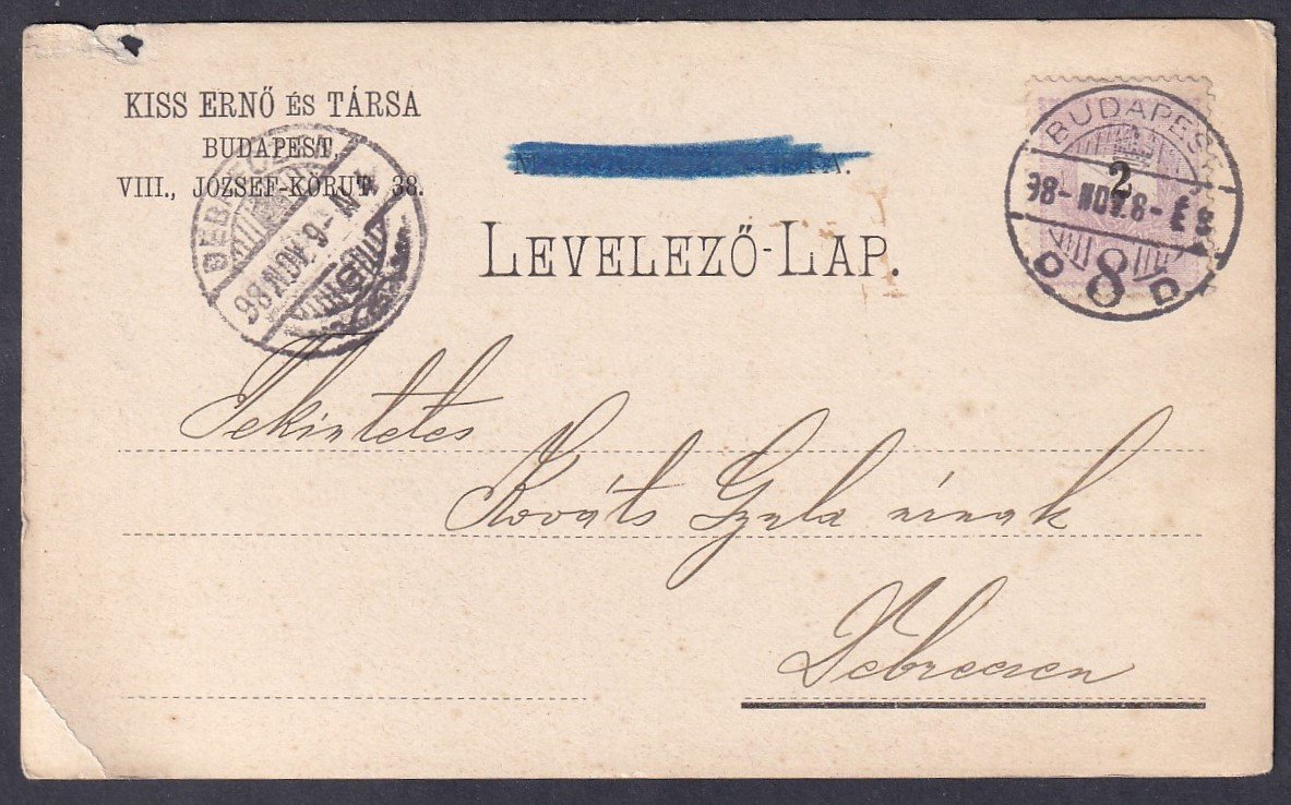 1898. Budapest, Debrecenbe feladott előre nyomtatott céges levelezőlap