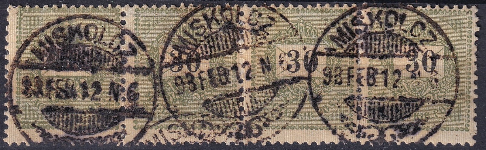1889. 30 kr – négyescsík, enyhén ferde fésűsfogazással, MISKOLCZ bélyegzéssel