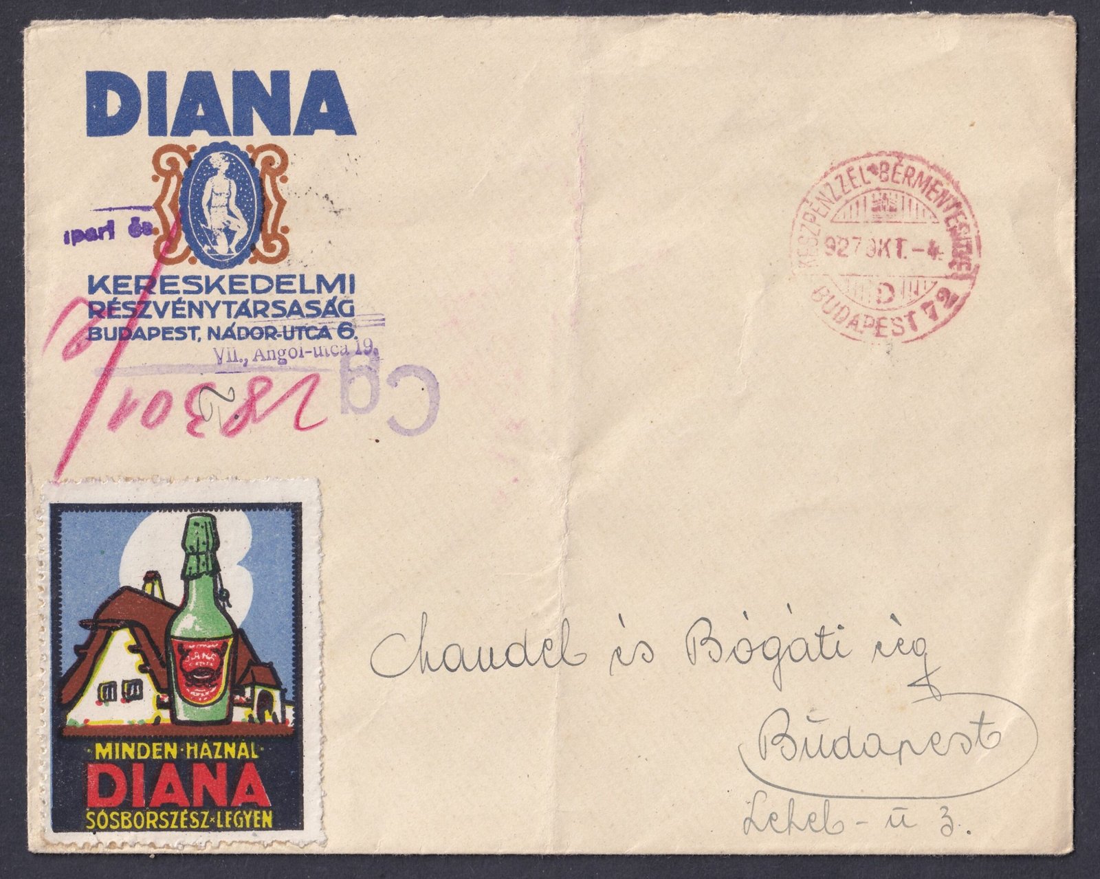 1927. Budapest – helyben, készpénz-bérmentesítéssel feladott, dekoratív céges boríték reklámlevélzáróval.