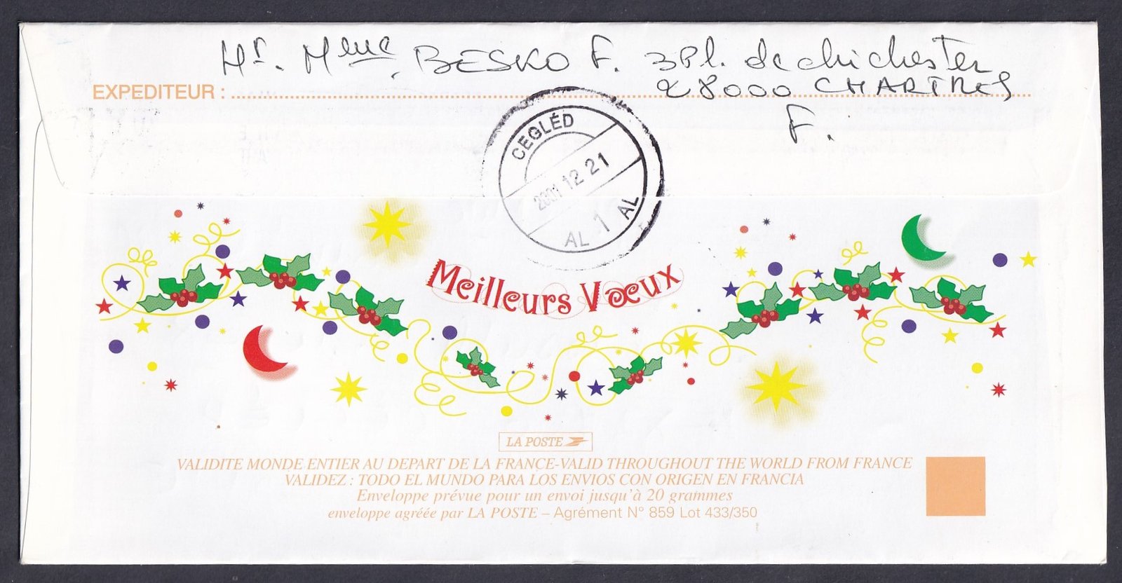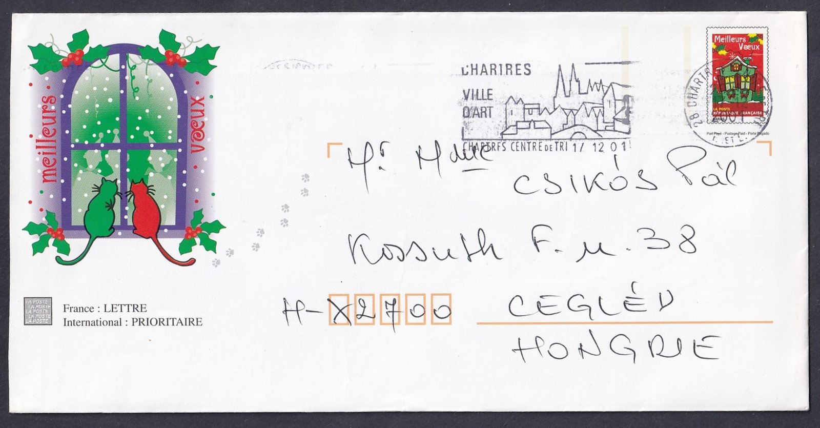 2001. Franciaország, Ceglédre feladott levél karácsonyi alkalmi díjjegyes képeslap