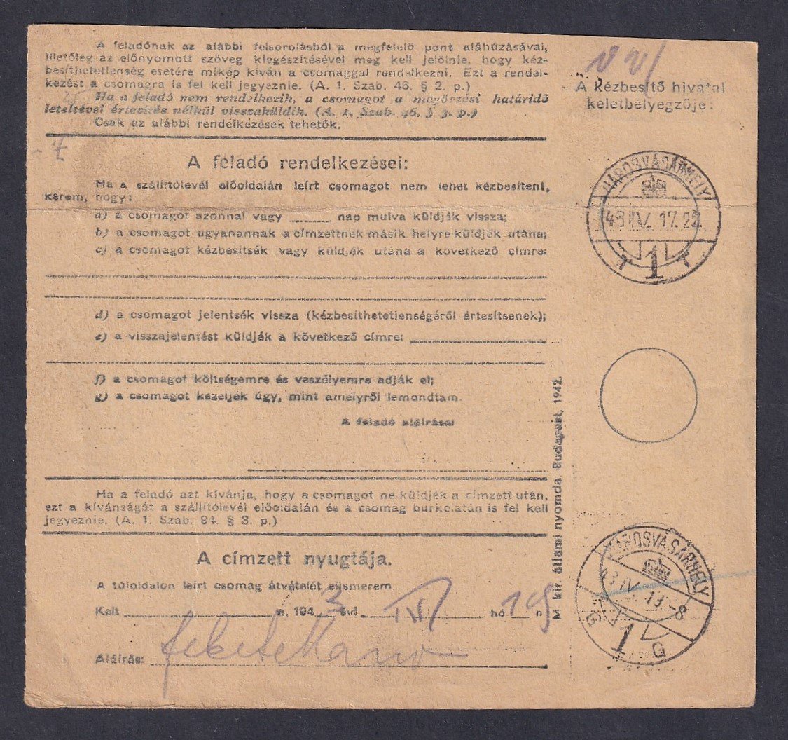 1943. Szarvas, Marosvásárhelyre feladott szállítólevél – ritkább desztináció