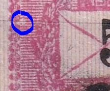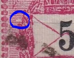 1889. 5kr /E/ lemezhiba, a koronátol balra a boríték felett folt – „kezdő állapot” a hiba ismer nagyobb méretű folttal is!