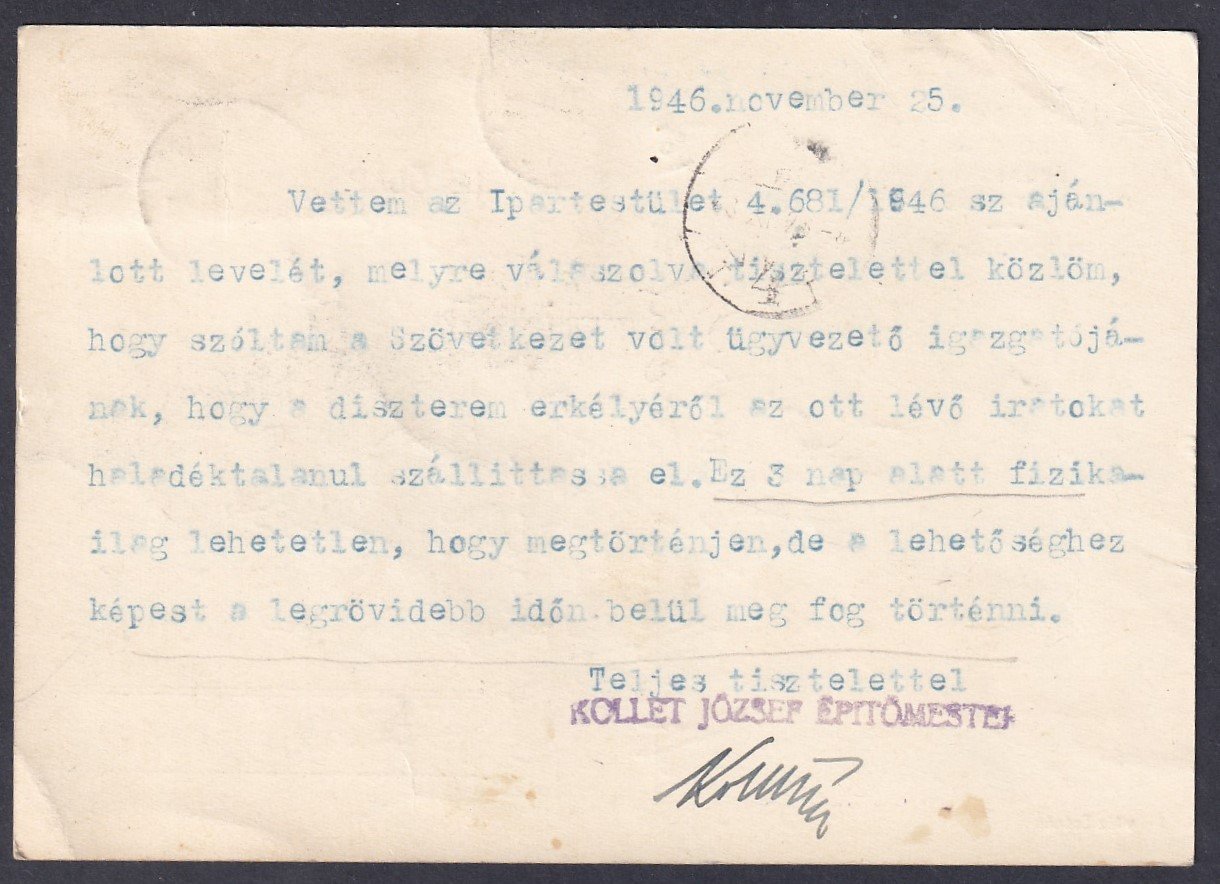 1947. Budapest, Pestújhelyre feladott levelezőlap