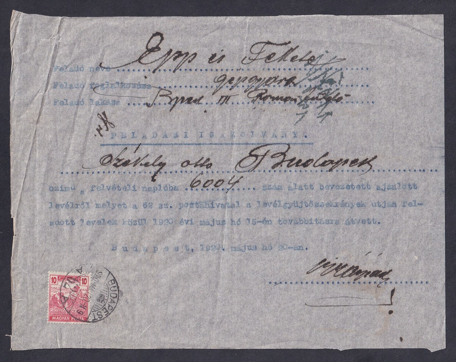 1920. Szükségből kiállított postai nyomtatvány – ajánlott levélről