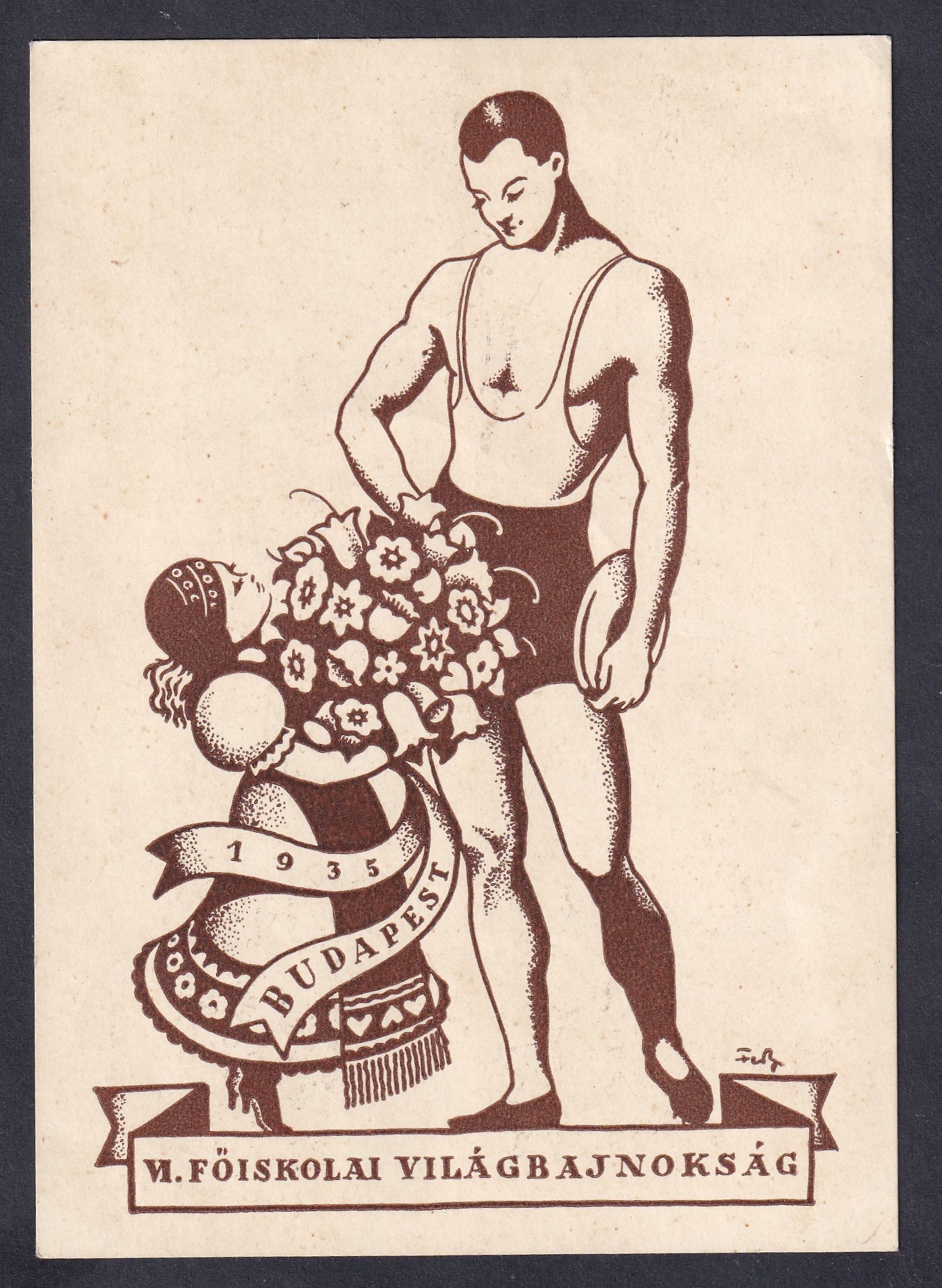 1935. Budapesti VI. Főiskolai Világbajnokság reklámképeslap, alkalmi bélyegzéssel ellátott, keretes emlékbélyegekkel