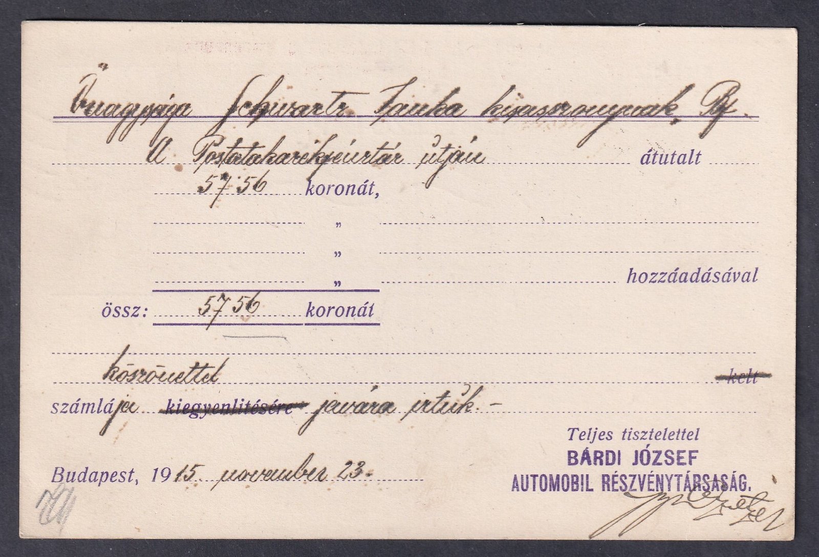 1915. Budapest, helyben feladott nagyon szép előrenyomott céges levelezőlap