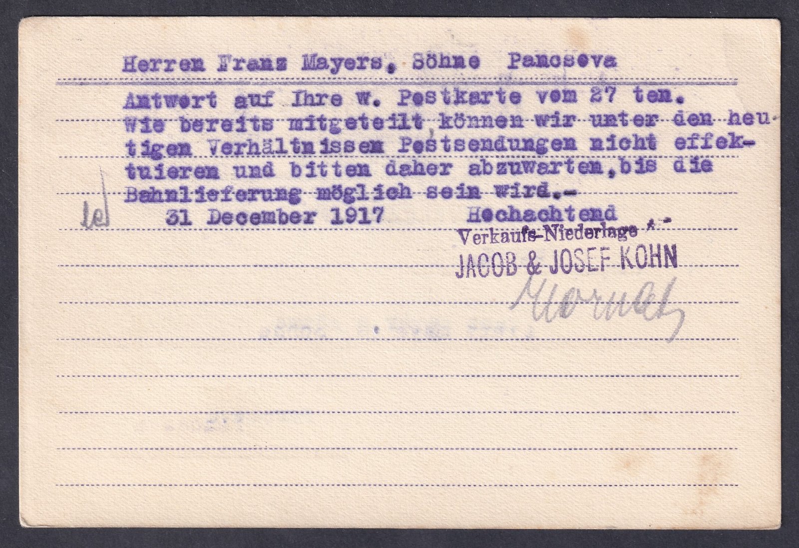 1917. Budapes, Pancsova-ra feladott céges levelezőlap