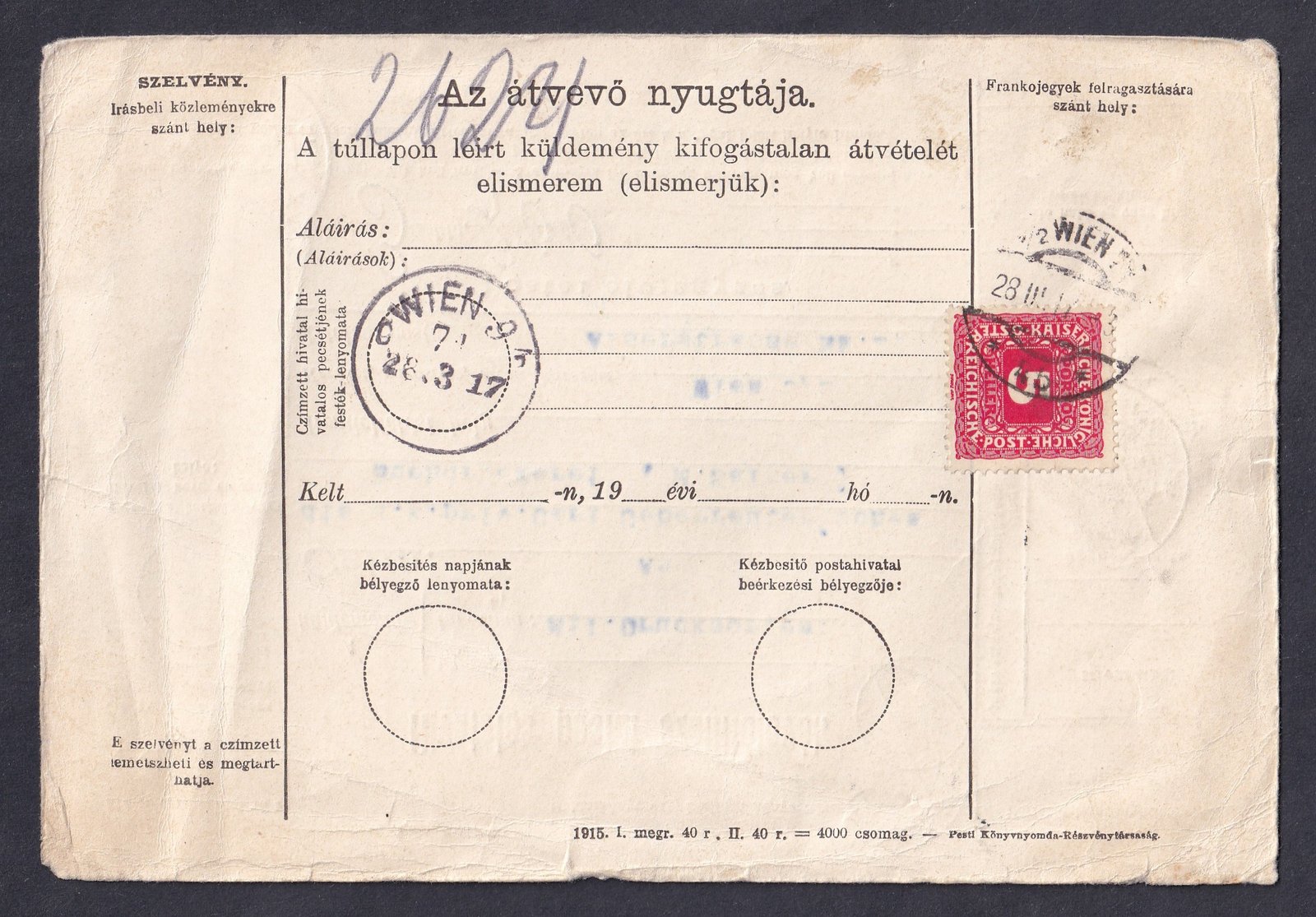 1917. k.u.k. hadifogolytábor (Hajmáskér) nyomtatvány-küldemény szállítólevele – Nagyon ritka, mivel az ilyen iratokat tömegesen megsemmisítették!