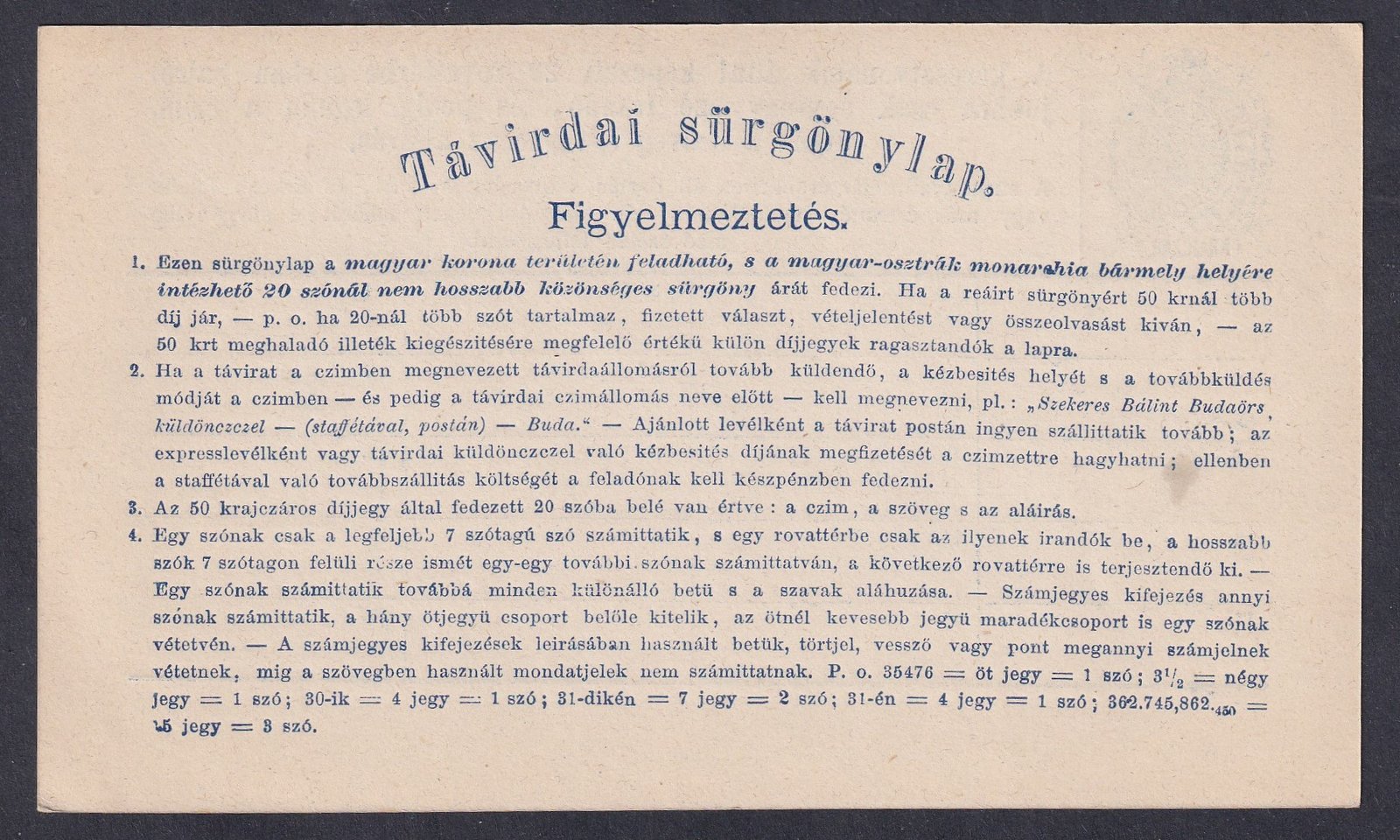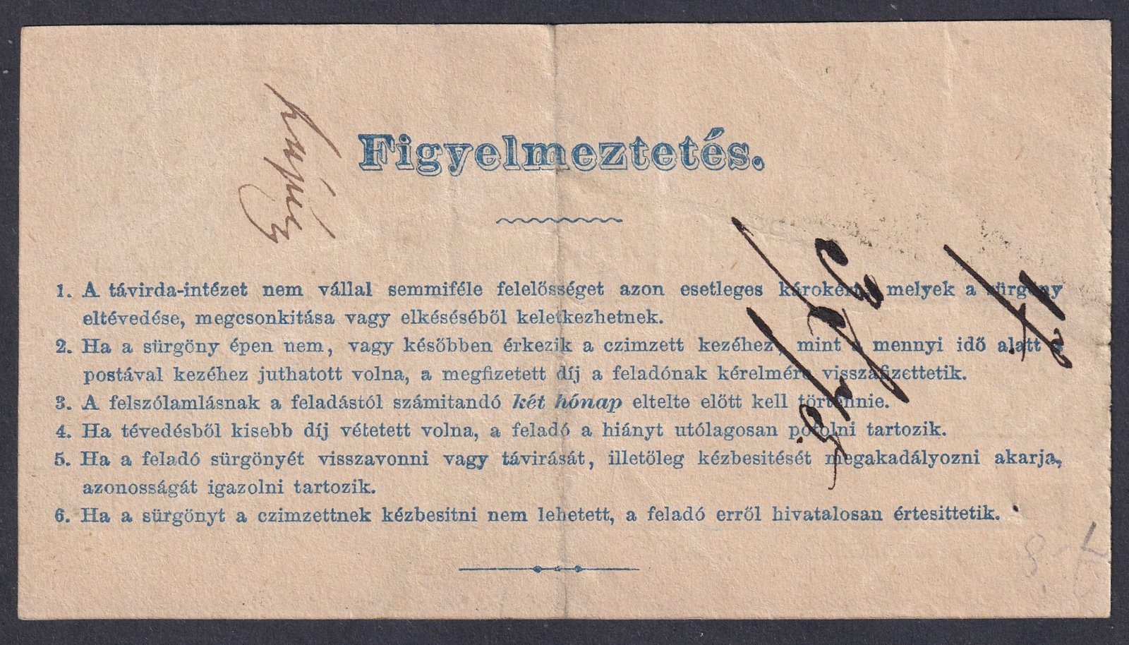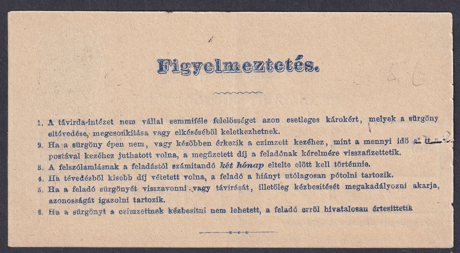 Romániából Magyarországra feladott távíratok rendkívül ritkák. Emellett a késői osztrák űrlap használata is különleges, postatörténeti szempontból értékes darab, kiállítási minőségben!