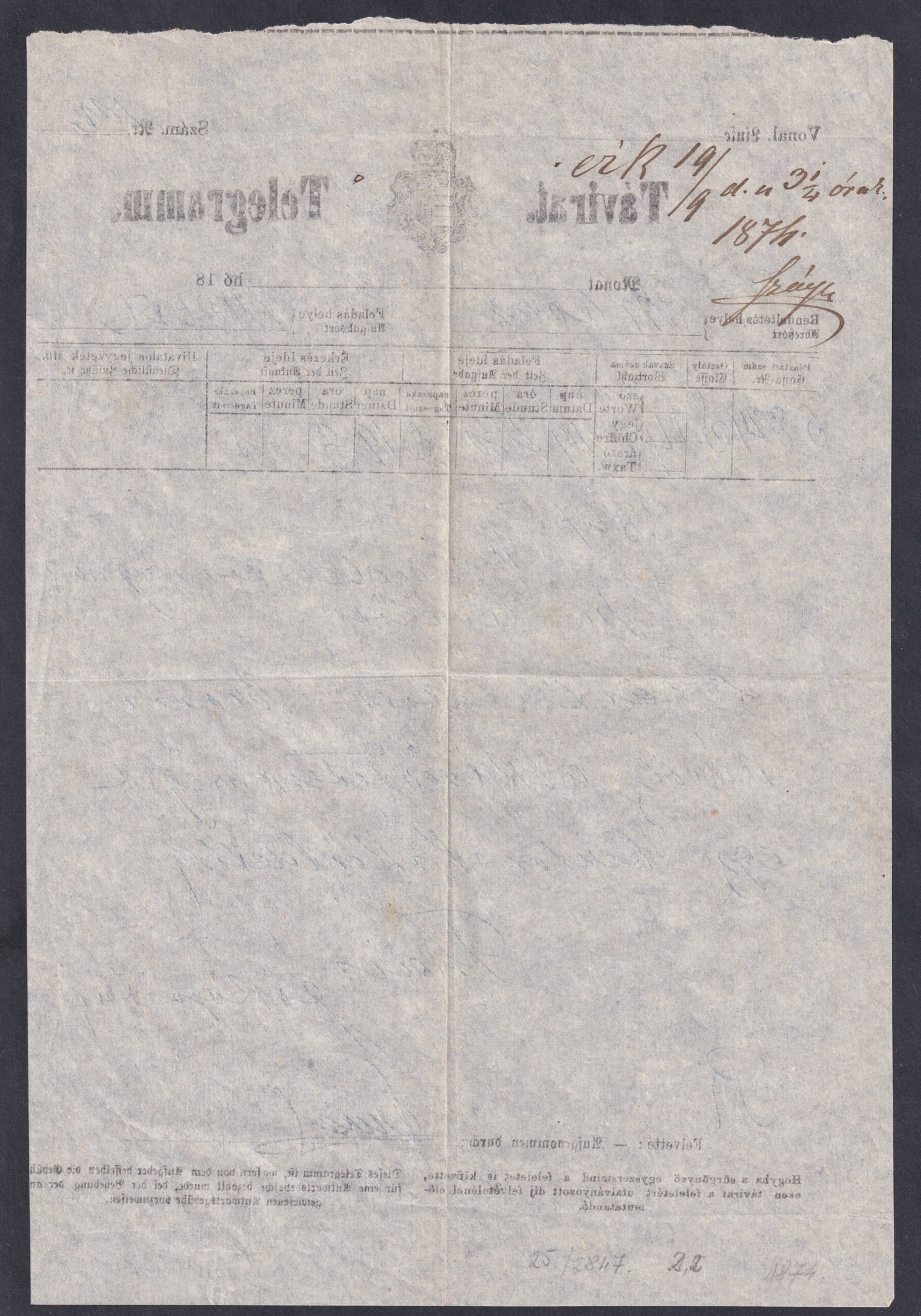 1874. Budapestről Monorra küldött rendőrségi távirat – Thaisz András rendőrfőkapitány (1873–1884) jegyzésével