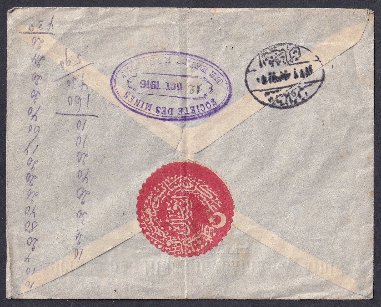 1916. Konstantinápoly – Bécs levél, Société des Mines de Balia-Karaïdin céges boríték, oszmán 5+5+20 para bérmentesítéssel, háborús cenzúra bélyegzéssel, hátoldalon dátumos érkezési jelzéssel