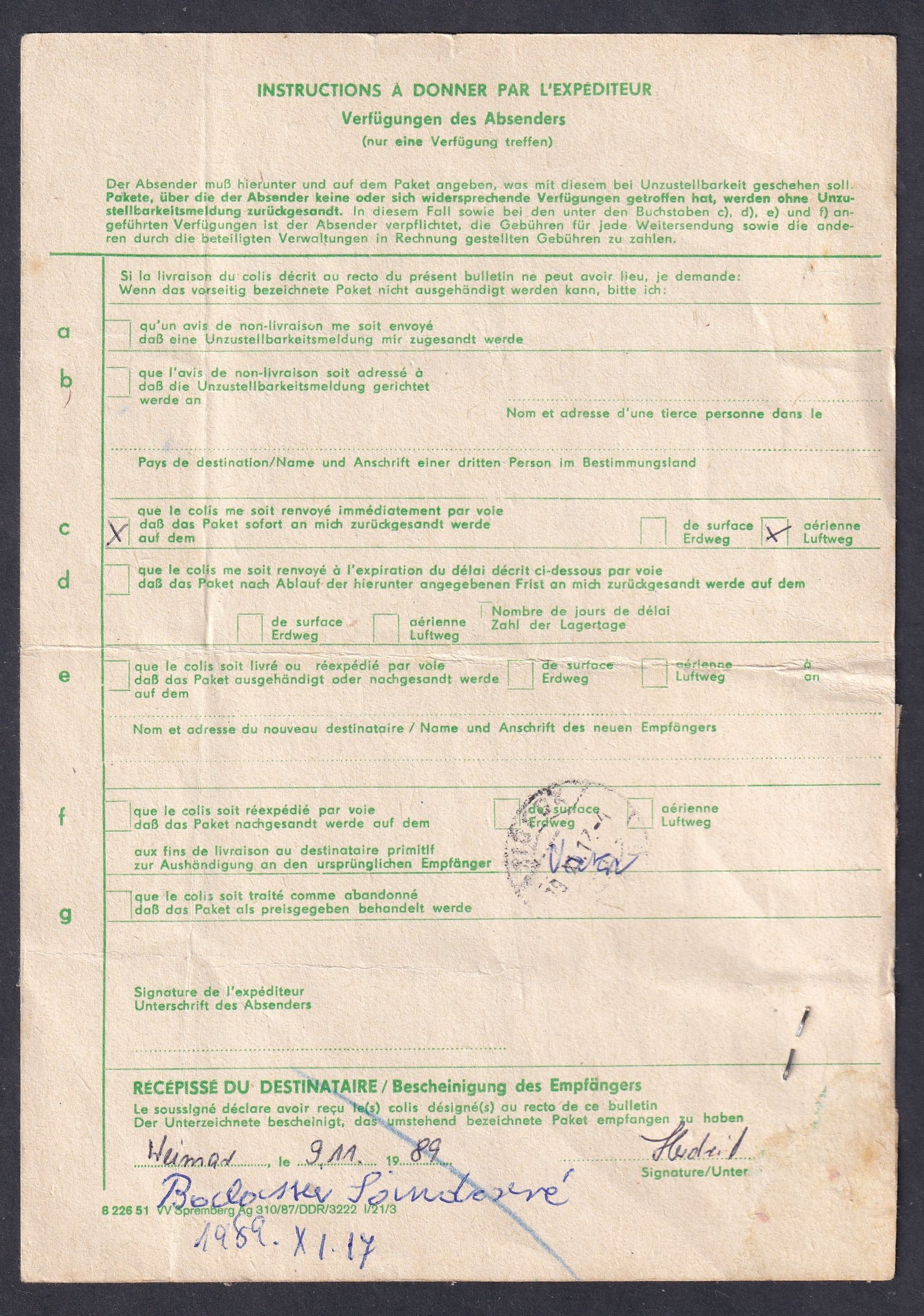 1987. NDK, Magyarországra feladott, vámkezelt szállítólevél