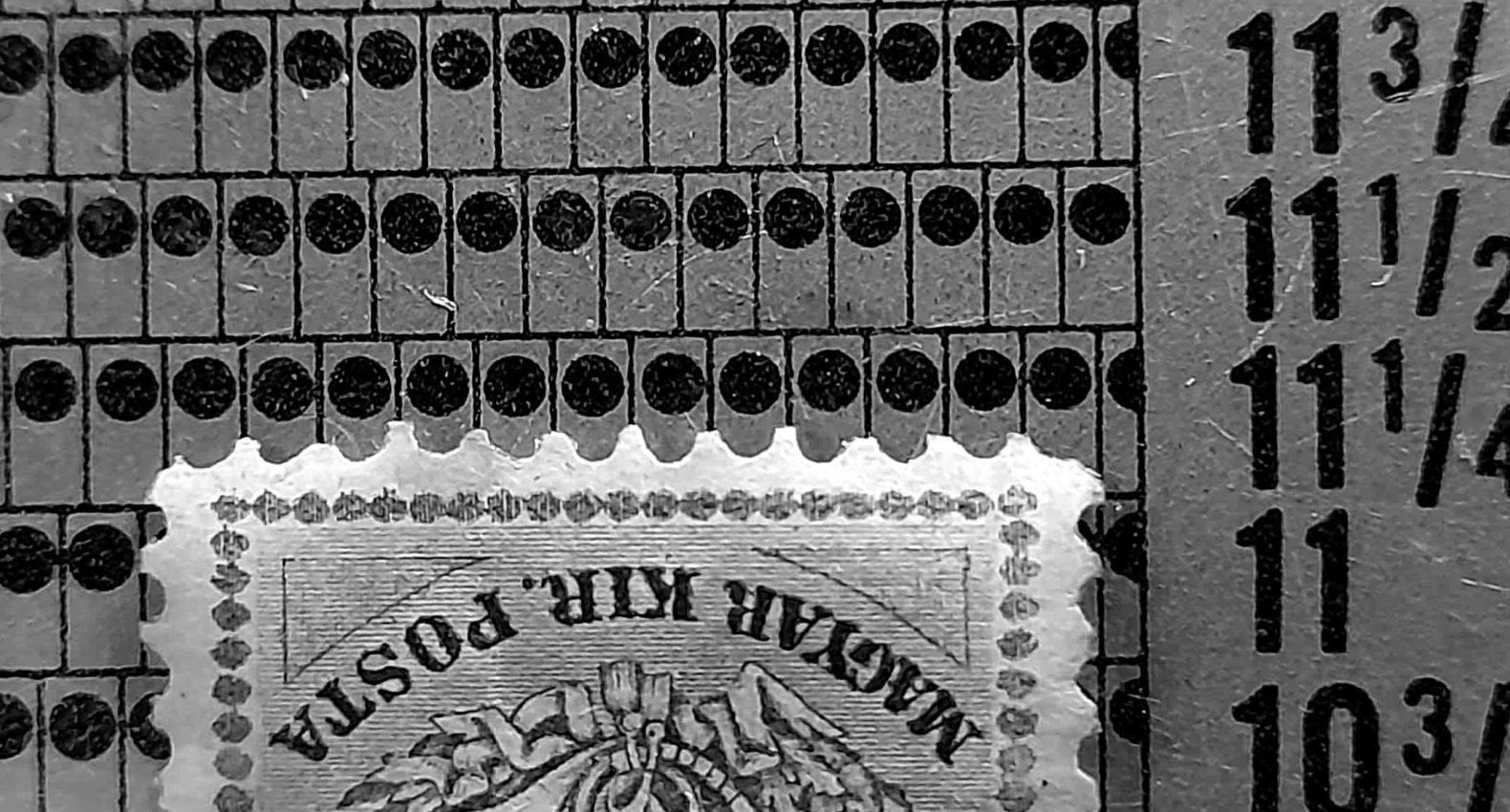 1881. Színesszámú 10 kr – Ritka: 11,1/4×11,1/2 szabályos vegyes fogazattal – ezzel a kombinációval (vízszintes oldal) a 11,1/4 fogazat a ritkább