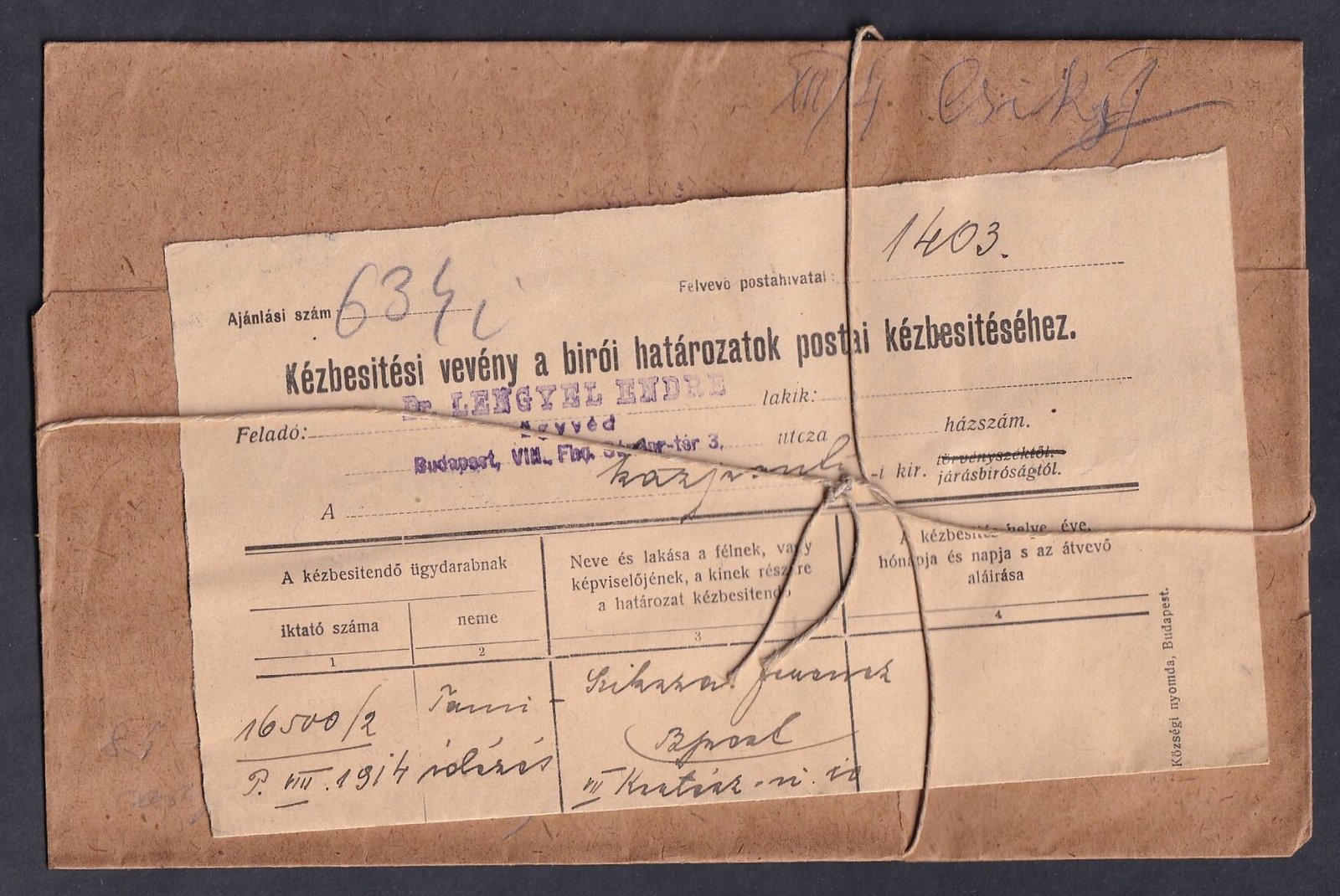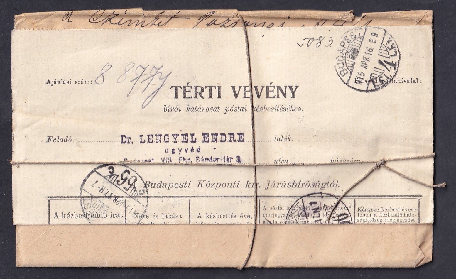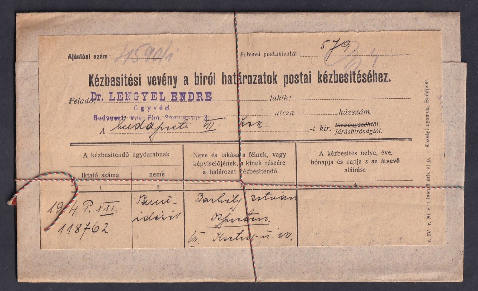1911. „Kézbesítési vevény a bírói határozatok postai kézbesítéséhez”, a Budapesti Királyi Járásbíróság eljárásában. Teljes egészében kitöltött, postai bélyegzéssel, kézbesítési és hatósági feljegyzésekkel. Ritka igazságügyi–postatörténeti dokumentum