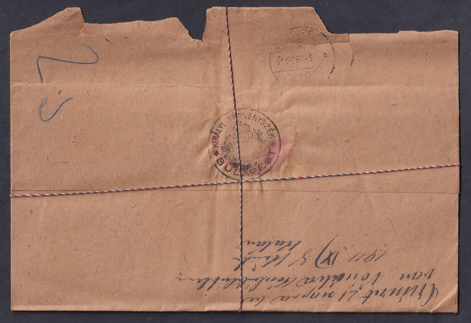 1911. A Budapesti Királyi Törvényszék által feladott ajánlott levél, nem kézbesített küldemény, eredeti, bontatlan levéltári csomagban megőrizve.