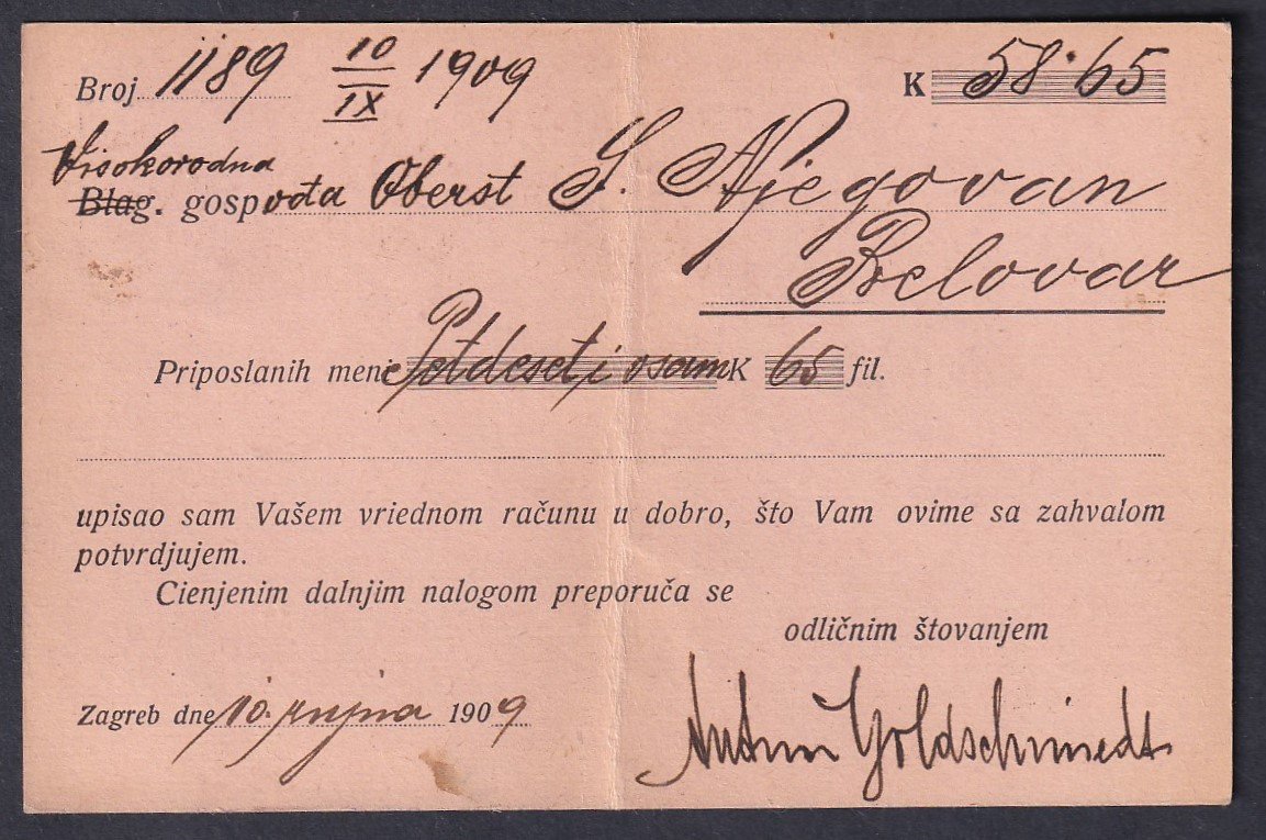 1909. Zábráb, Belovárra feladott céges levelezőlap