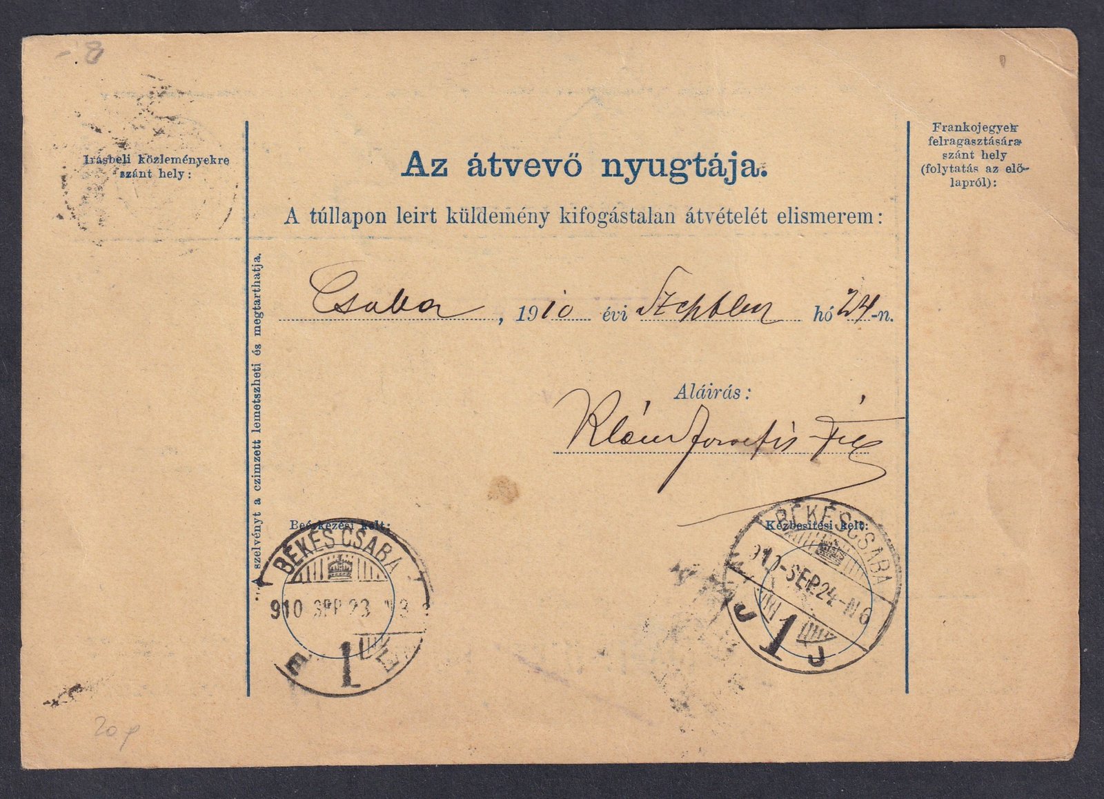 1910. Pozsony – Békéscsabára feladott szállítólevél