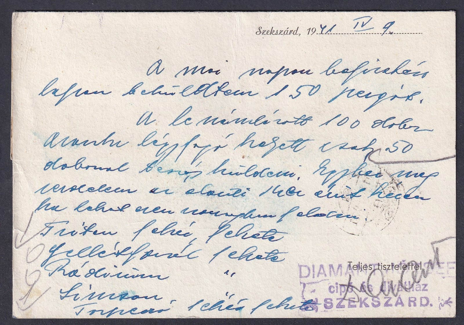 1941. Szekszárd, Budapestre feladott levelezőlap