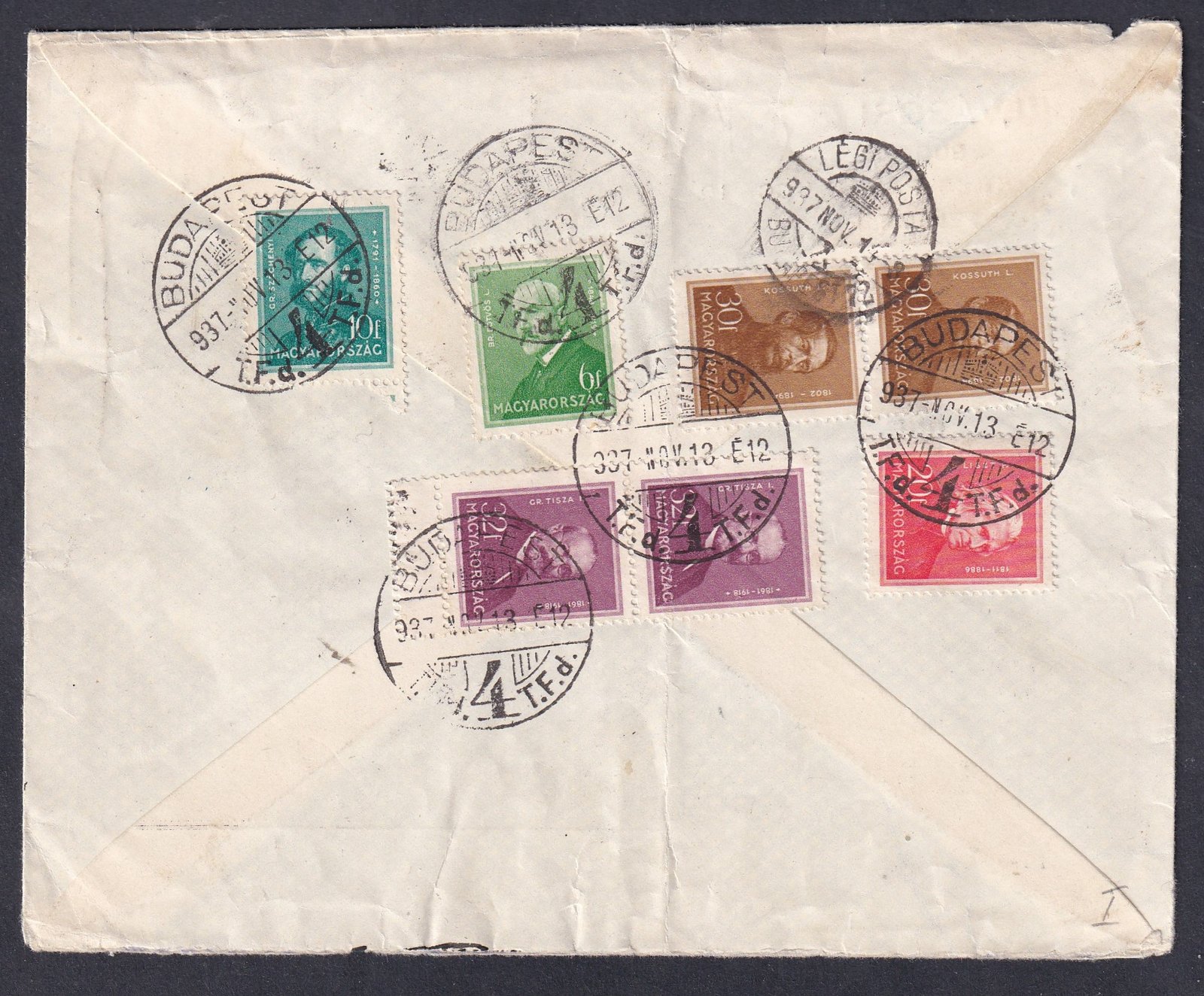 1937. Budapest, Malmö (Svédország)-ba expressz-légiposta levél, többes 5-színű Arcképek bérmentesítéssel