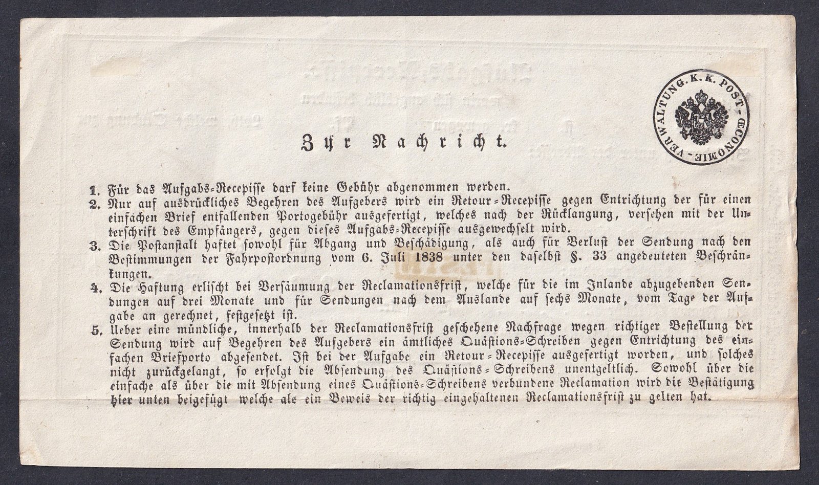 1858. Großwardein, Brünn-be feladott kézzel írt: Retour Recepisse,(Térti vevény) – szükségből kiállított postai nyomtatvány /R/