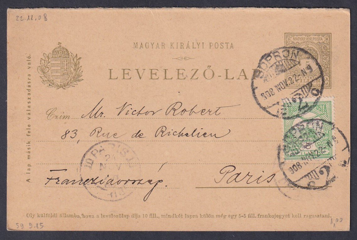1908. Sopron, Párizsba feladott levelezőlap, előlapon PÁRIZS érkezési bélyegzéssel (2 nap alatt odaért)