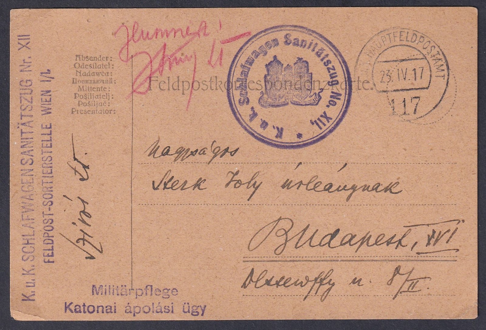 1917. Budapestre feladott Tábori posta levelezőlap – „K.u.k. Schlafwagen Sanitätszug Nr. XII” (császári és királyi hálókocsi egészségügyi vonat, XII.