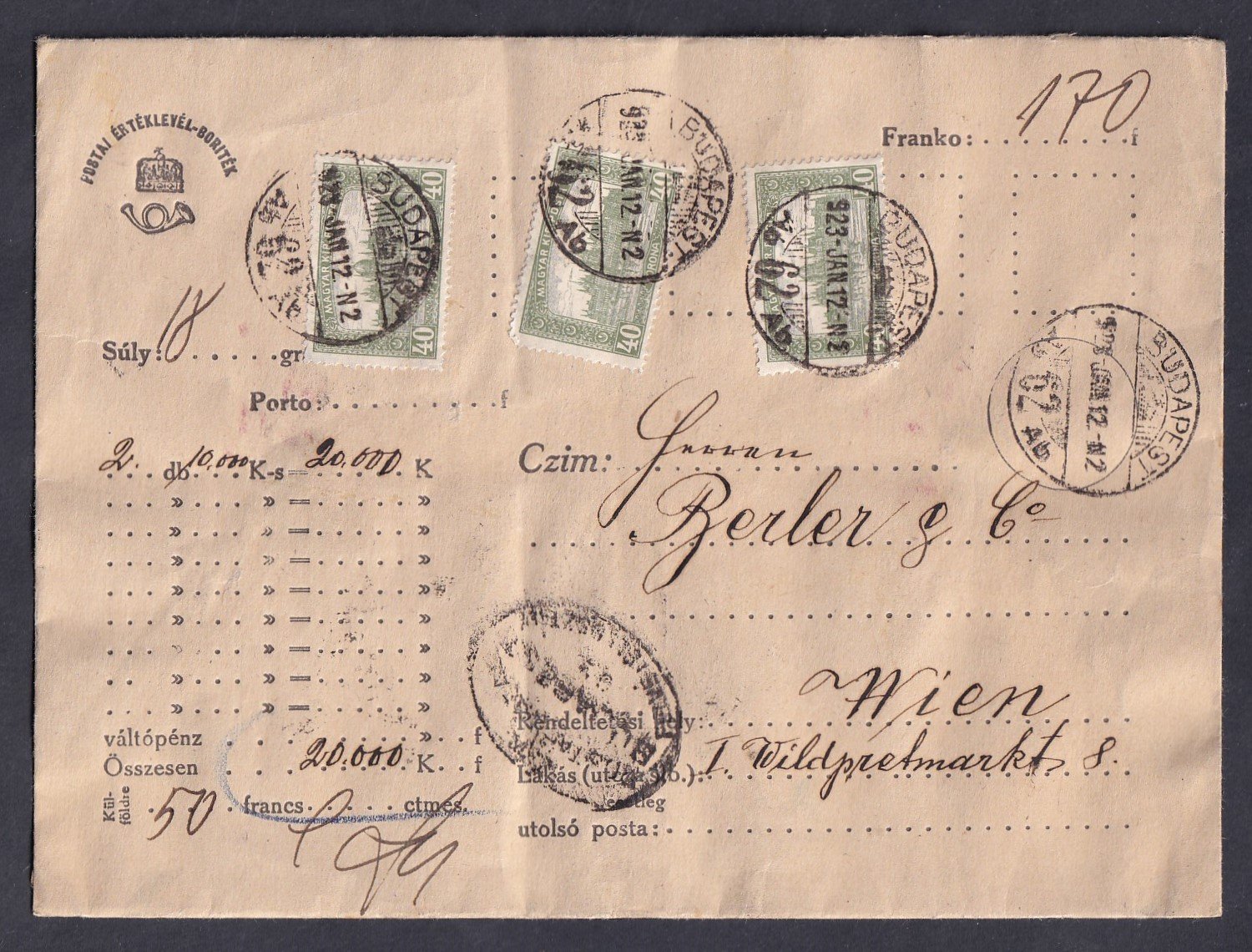 1923. Budapest, Bécsbe feladott értéklevél – 6 díjsz.